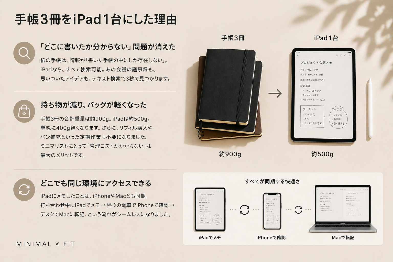 手帳3冊がiPad1台になった。これは単なる「デジタル化」ではなく、情報管理の質が変わった体験でした。検索できる・どこからでもアクセスできる・持ち物が減る——これだけで40代の仕事・生活の質は上がります。