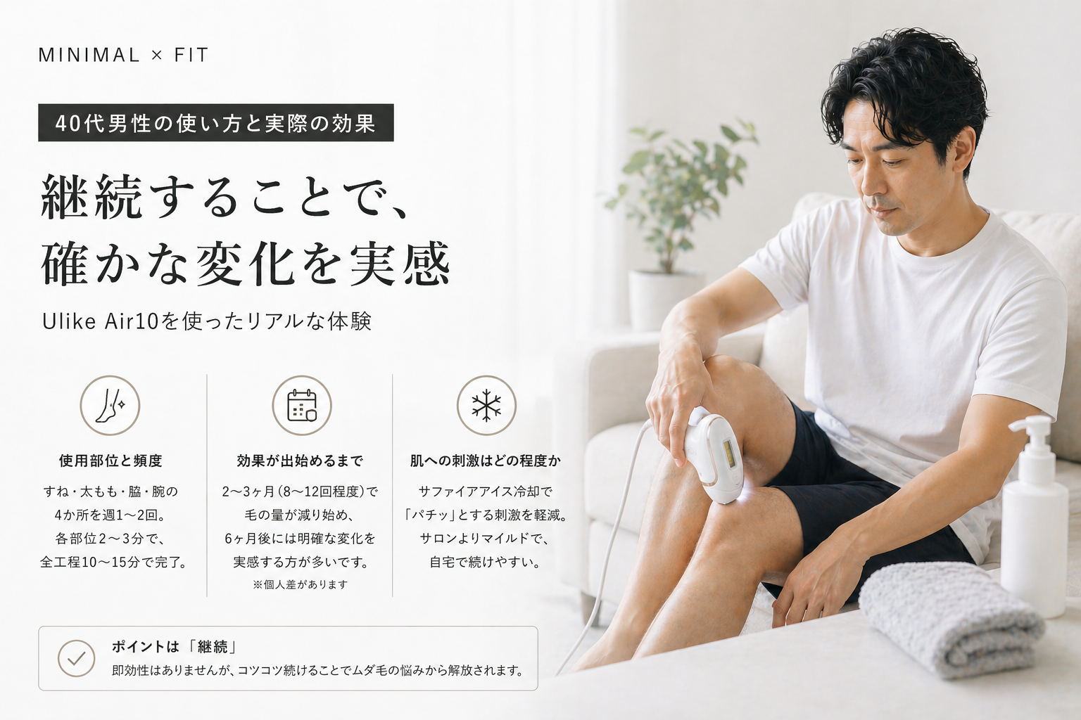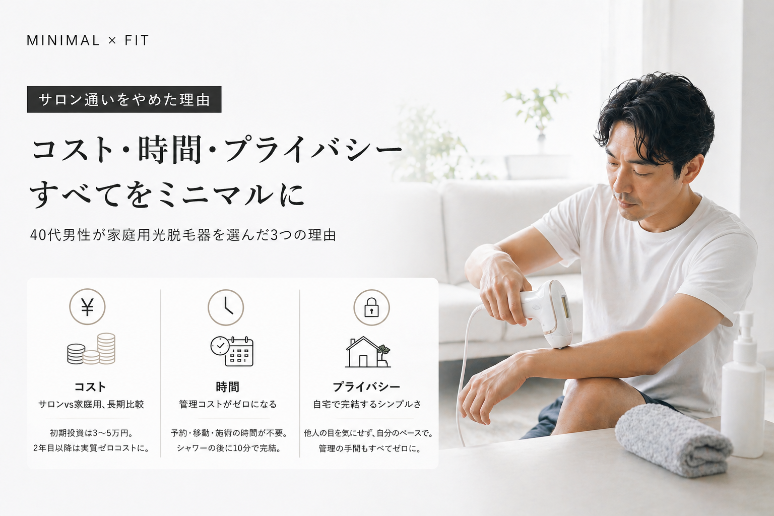 40代男性の脱毛は「清潔感の維持」という観点で、ファッションや体臭ケアと同じく重要なセルフケアです。サロンに通う「予約・移動・費用」という管理コストをゼロにして、自宅で完結させる。これがミニマリスト的な選択です。
